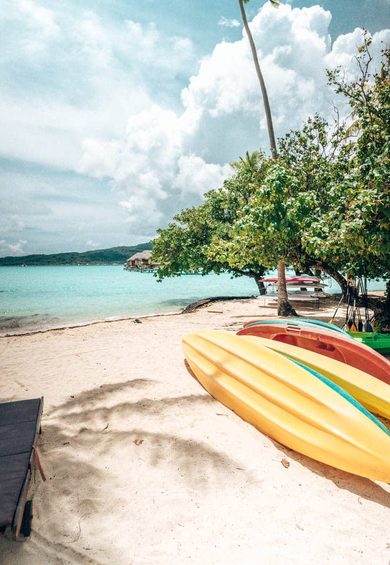 The lagoon is pristine, calm and completely swimmable. Shallow blue lagoon extends as far as the eye can see and guests have access to explore the entire surroundings via kayak and paddleboard or snorkeling. It’s located just 5-10 minutes by boat from the main island of Tahaa where guests have access to exploring the local island that includes a rum factory, vanilla factory and some shops.