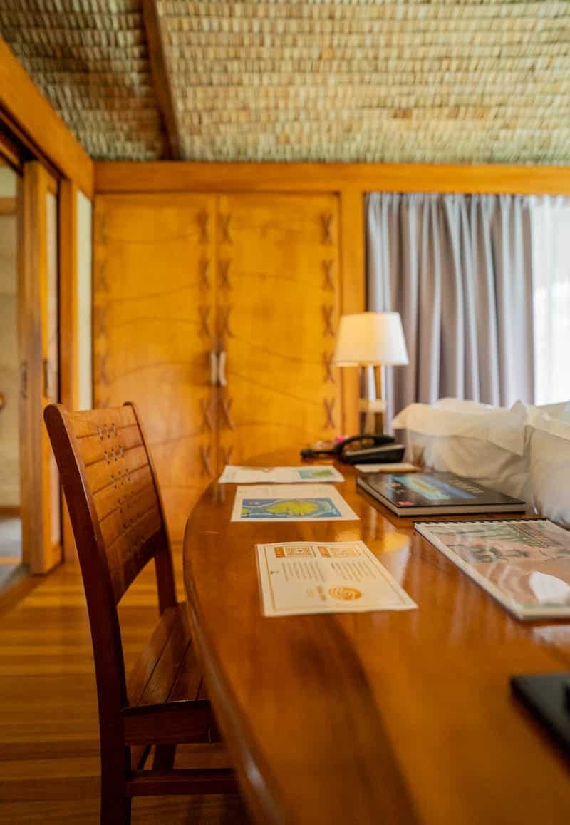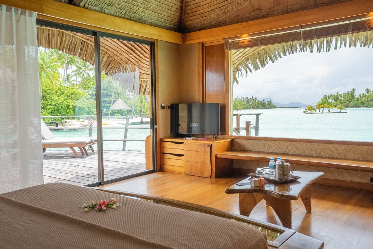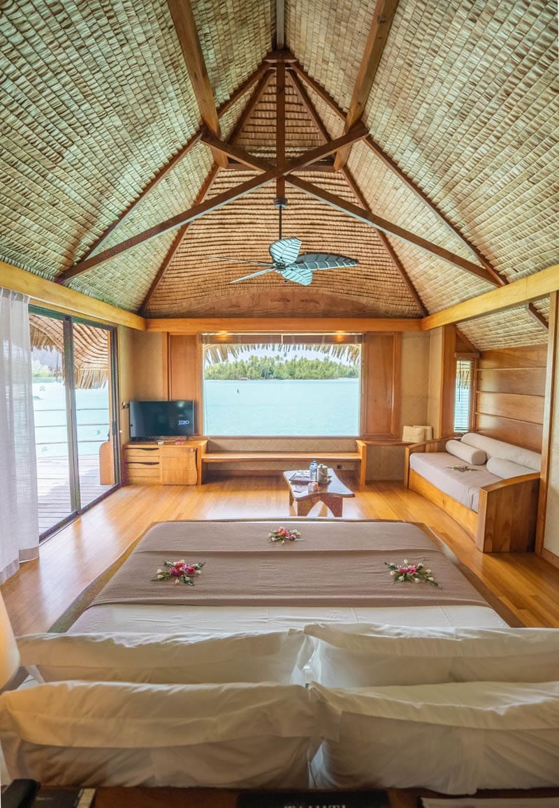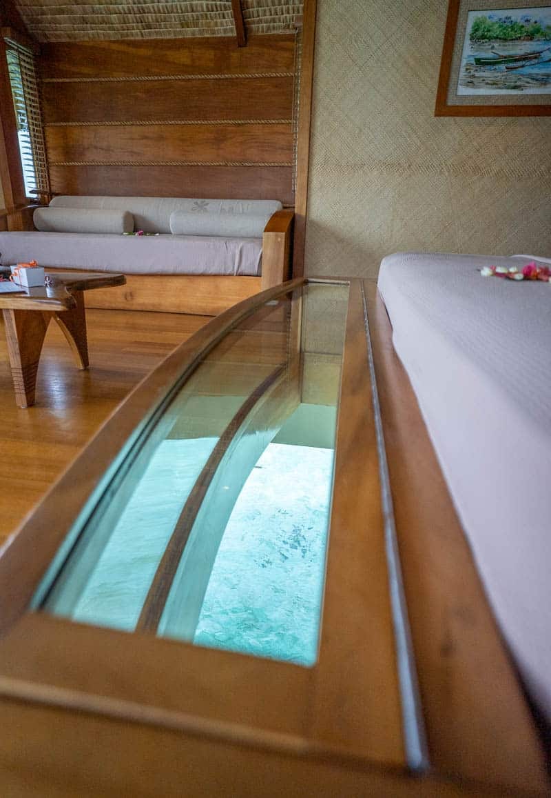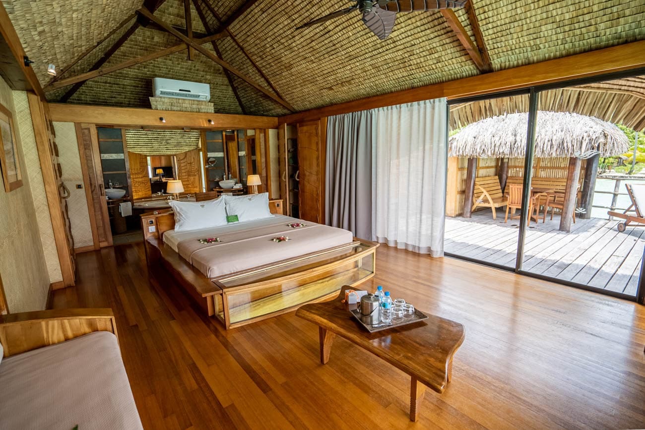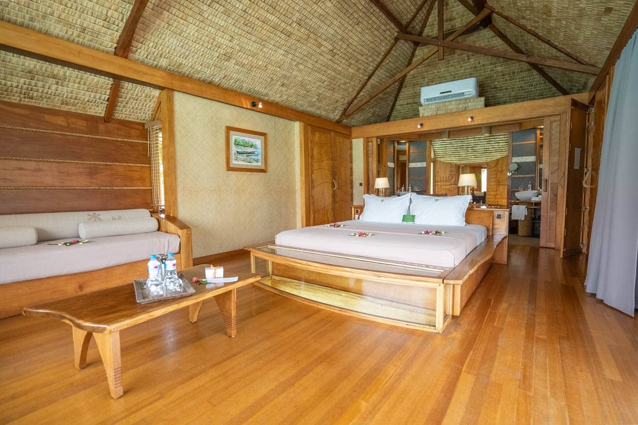 The rooms have undergone a small refresh and the style is very rustic. While they are missing some cushions and comfortable nooks, we love the Tahitian style and use of beautiful woods and natural elements. There is also a glass bottom table built into the bed that makes for amazing nightly viewing.