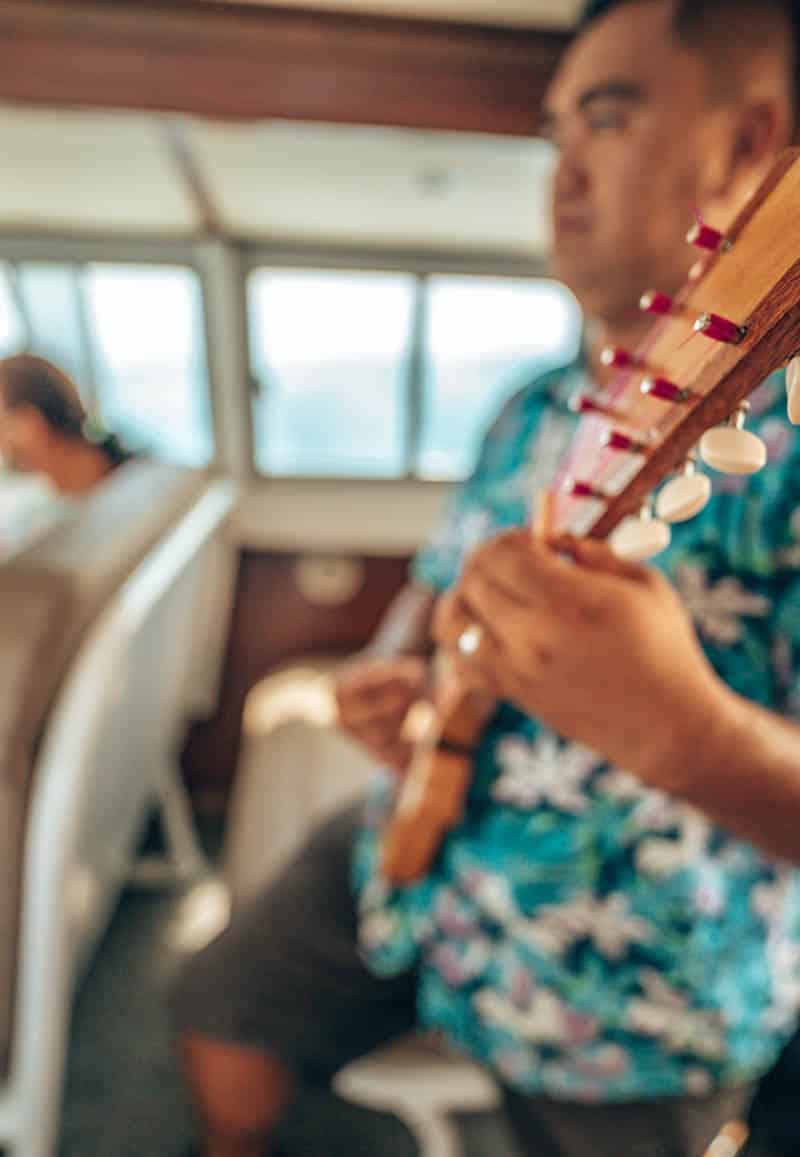 Guests are greeted at the airport in Raiatea by representatives from Le Tahaa and quickly escorted to the waiting boat. The entire process of deplaning to getting to the boat was about 10 minutes and once we picked up our luggage we didn’t see it again until we were in the room. The boat ride is approximately 20 minutes and we were offered water as well as some music by the hotel representative who played the ukulele for us. The boat ride was magical, with beautiful scenery and gorgeous music.