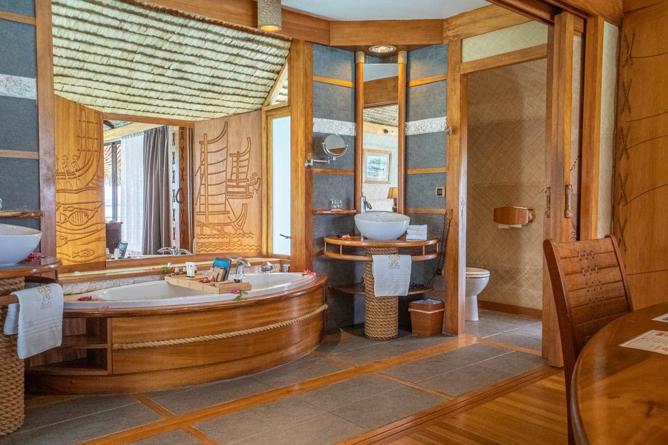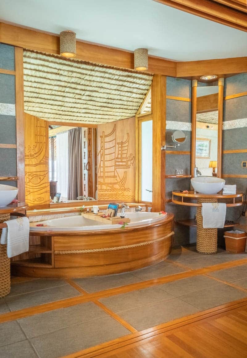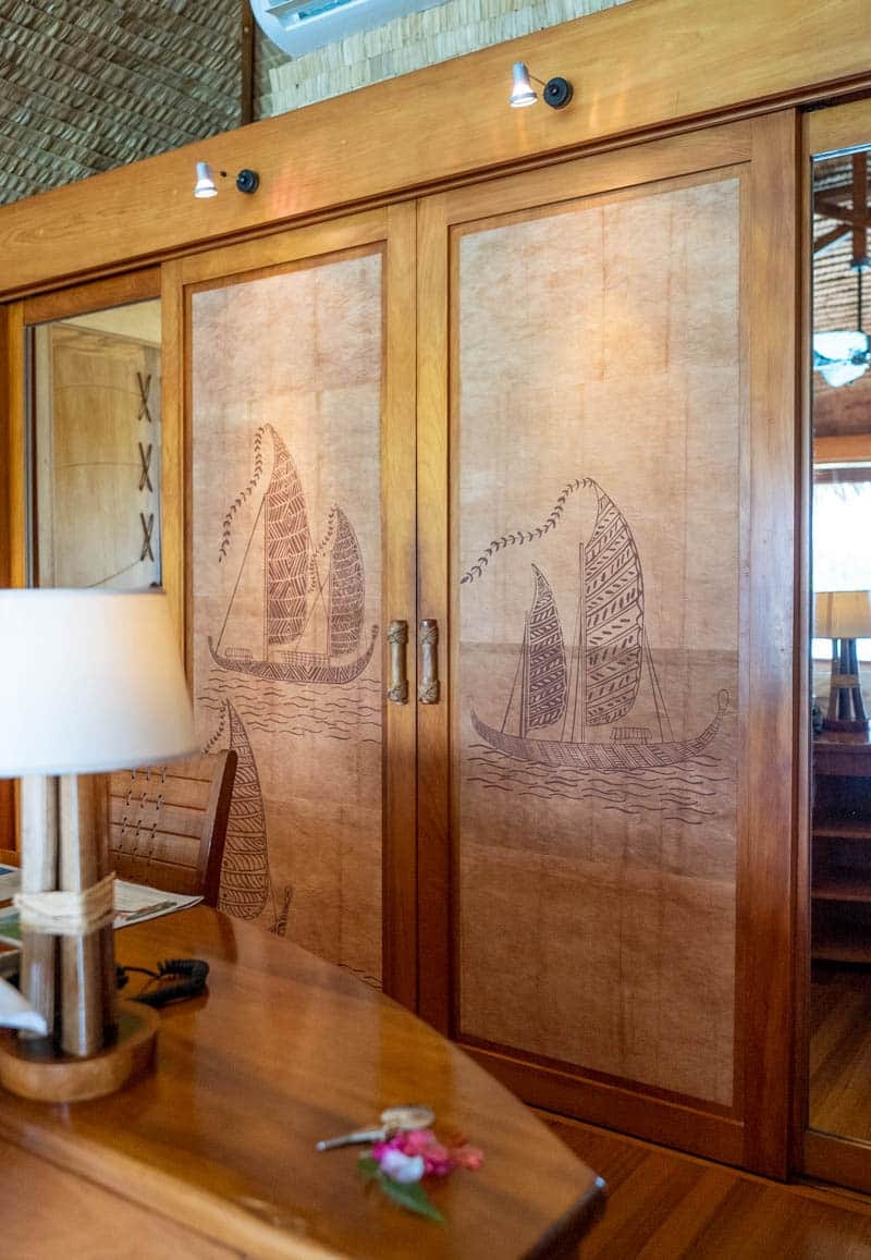 The style on property is rustic, homey and very traditional to the Tahitian style. We love the natural wood elements, the artwork throughout and the incorporation of natural features into the construction of the rooms. The decorated door panels to the bathroom are beautiful and elegant and this is present throughout.