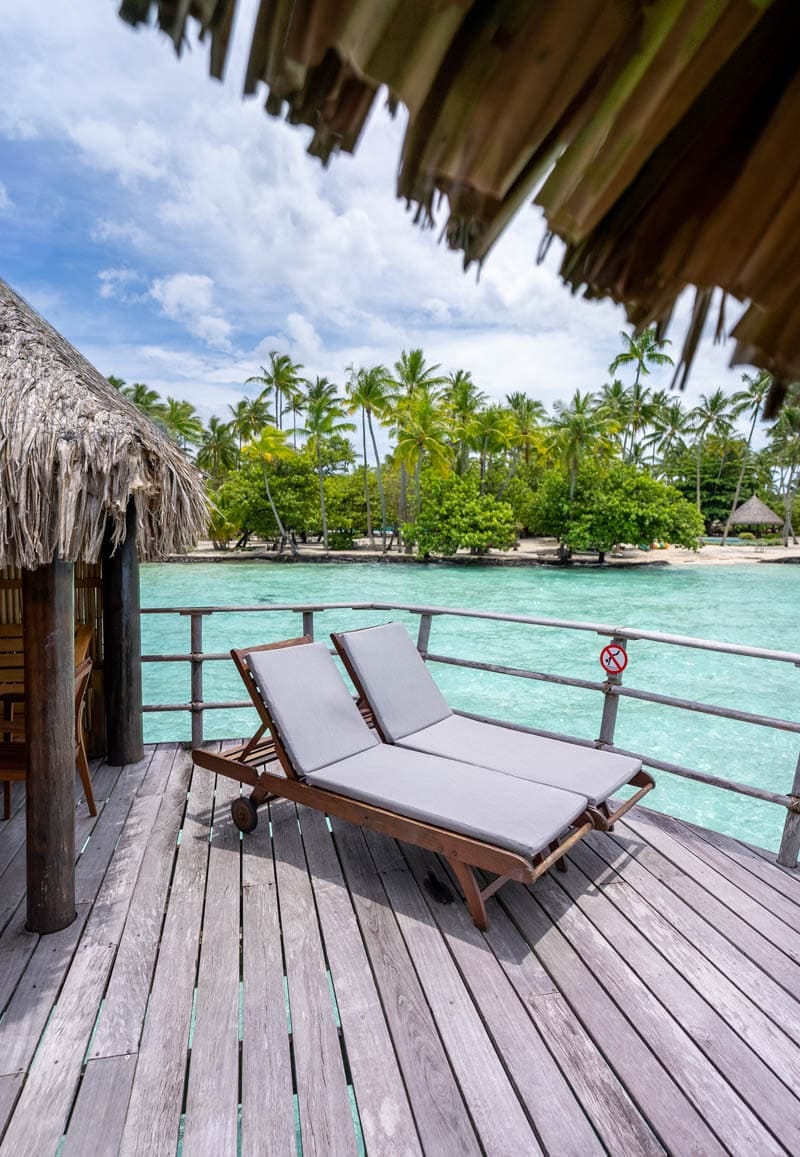 The exterior features a large terrace with covered patio and two chaise lounges as well as direct access to the lagoon. The patio is very private (with the exception of room 001 and a few standard overwater that face the beach).