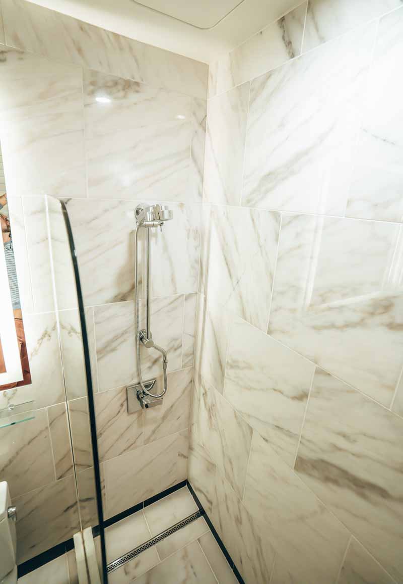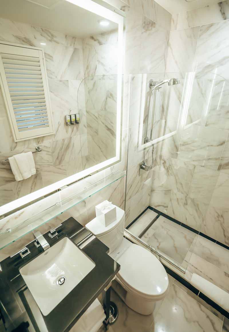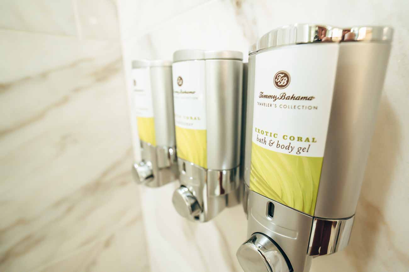 The bathroom, while also small, is beautiful. Marble covers the walls and floor and the walk-in shower had excellent pressure. I loved the Tommy Bahama products in eco-friendly wall-mounted containers.