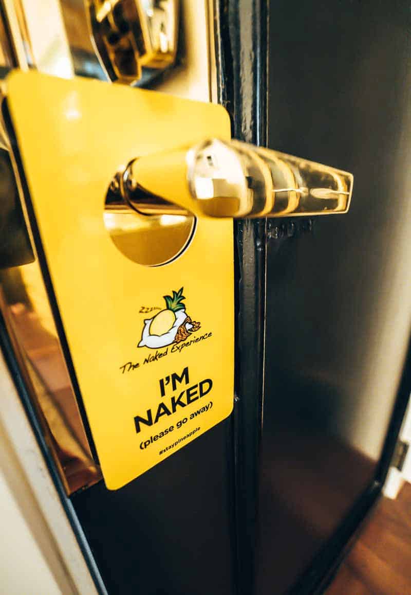The King bed took up most of the room with it’s lush, fluffy bedding, aptly named “The Naked Experience”. I didn’t quite understand the name until I got into the bed… it was the most comfortable bed I’ve slept in at a hotel…possibly ever. I briefly considered stealing all the bedding (not kidding). The Staypineapple branding continued with an adorable “Sleep with me” pillow and plush dog toy for purchase.