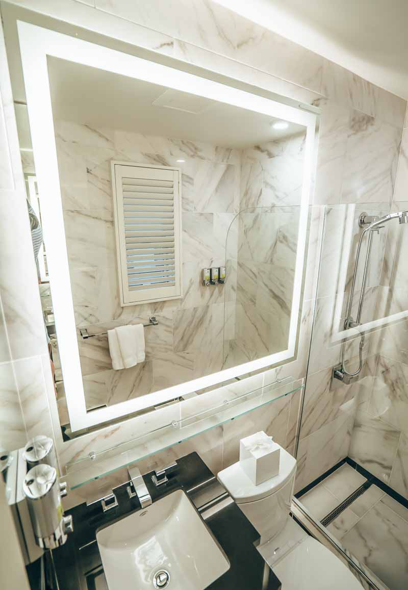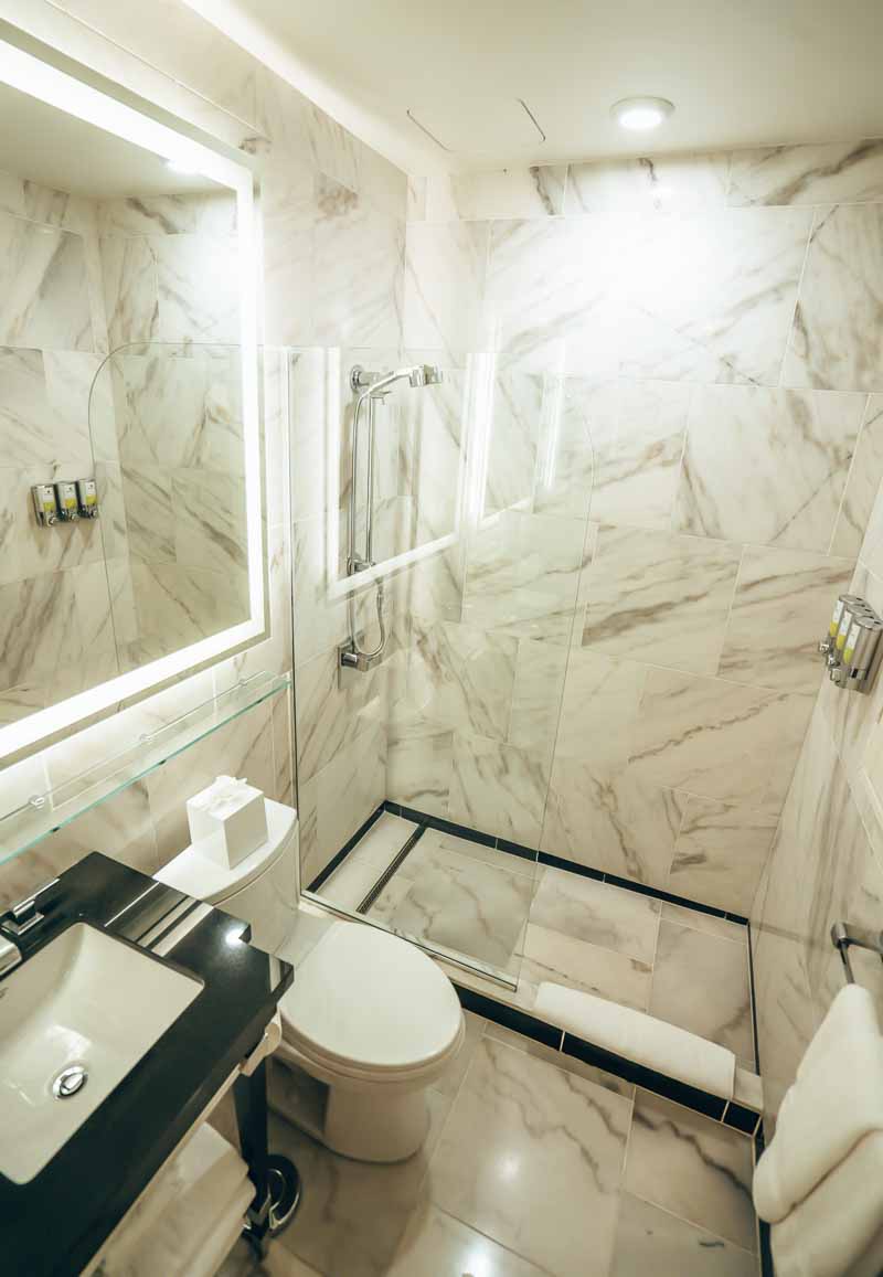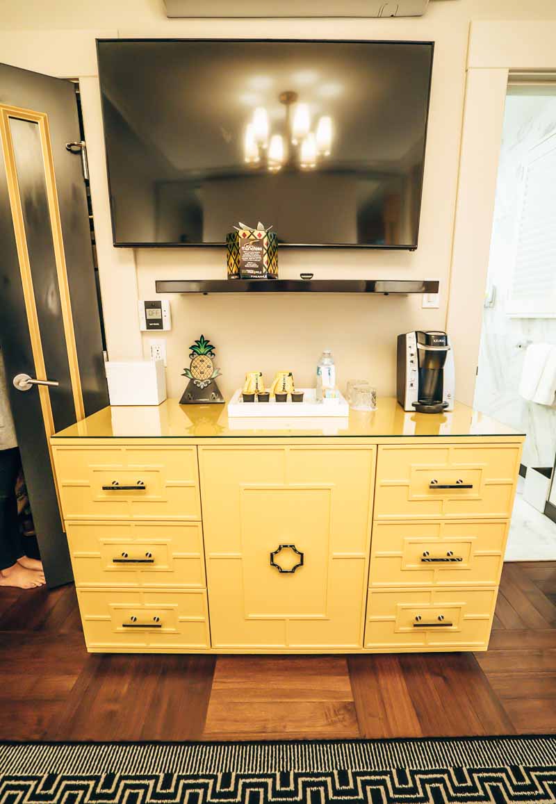 While quite small, the rooms are so cozy and well-equipped. The attention to detail is excellent and it seems they thought of pretty much everything. In our Celebrity King room, there were Staypineapple branded Keurig pods, a bottle opener, ample glassware and a mini-fridge in a beautiful lacquered armoire.