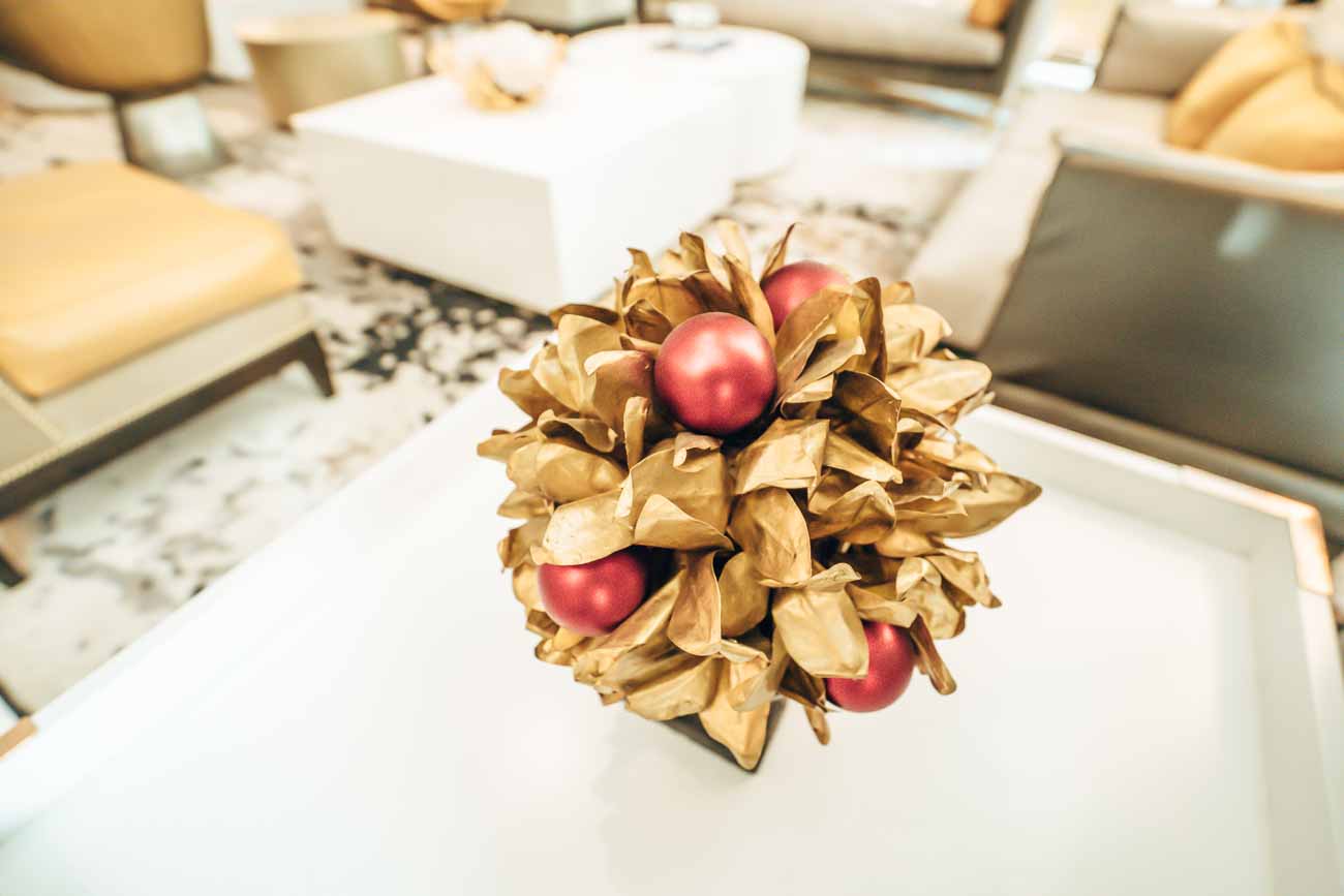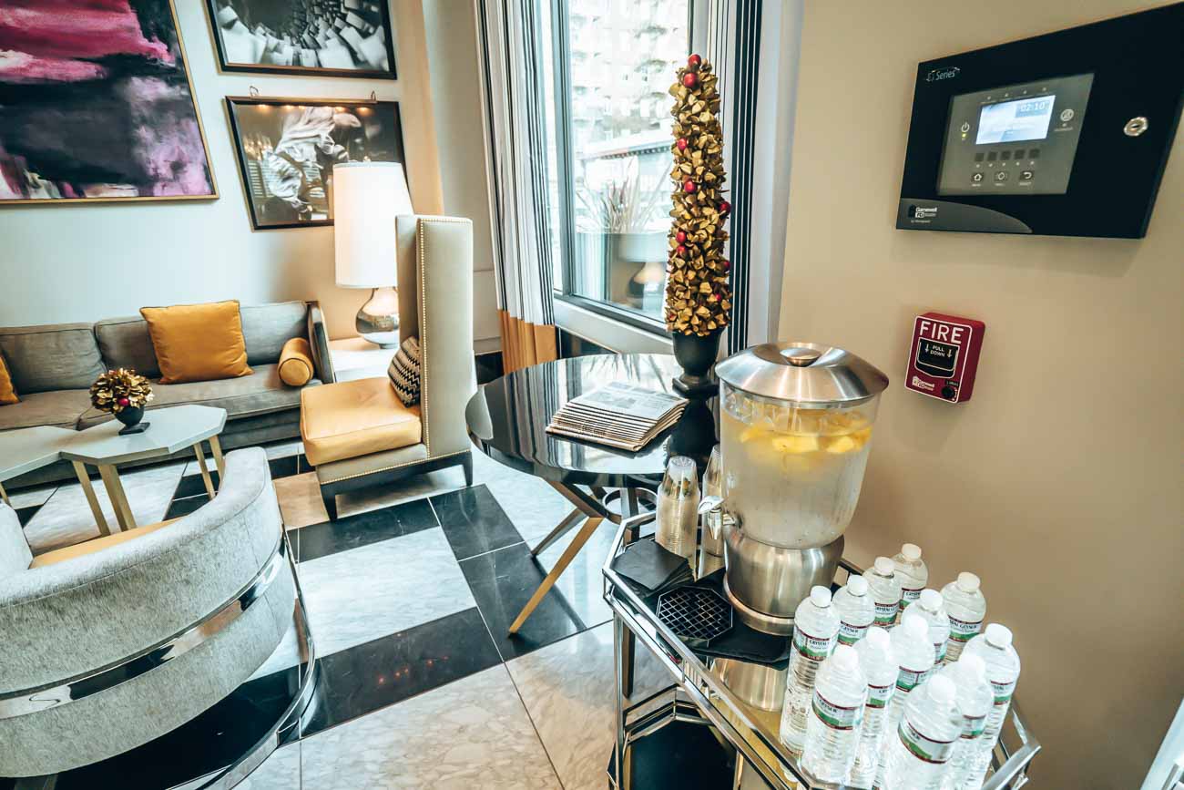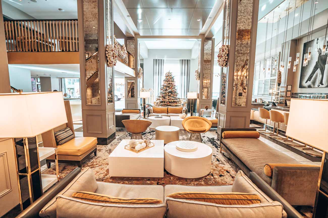 While the reception desk is very nondescript and located in front of the door, the lobby itself is stunning. We were there during the holidays and beautiful decorations adorned the lobby lounge. The Staypineapple yellow color accented the cushions, lighting and decor in a beautiful way. There is ample seating for lounging, working and chatting. It was very homey and cozy, which makes me want to hang out there all day.